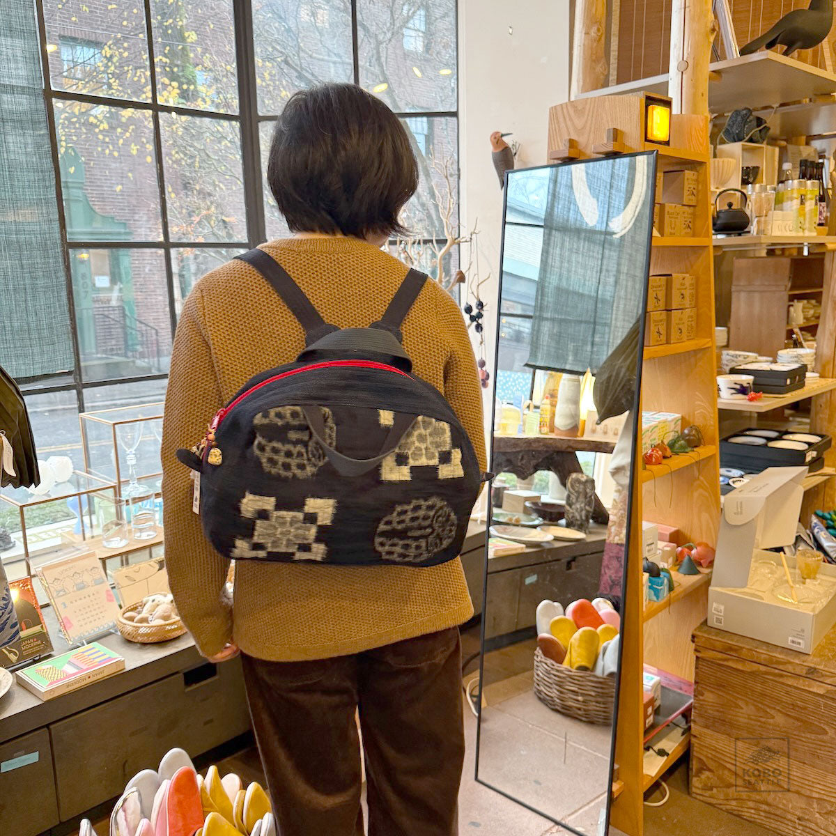 Handmade bag by Noriko's mom in Japan. Carefully chosen vintage kimono fabrics, interior pockets and attention to details like beads on the zipper pulls is what makes this piece very special. Wear as a backpack or tote around with shorty handles. Two interior pockets.