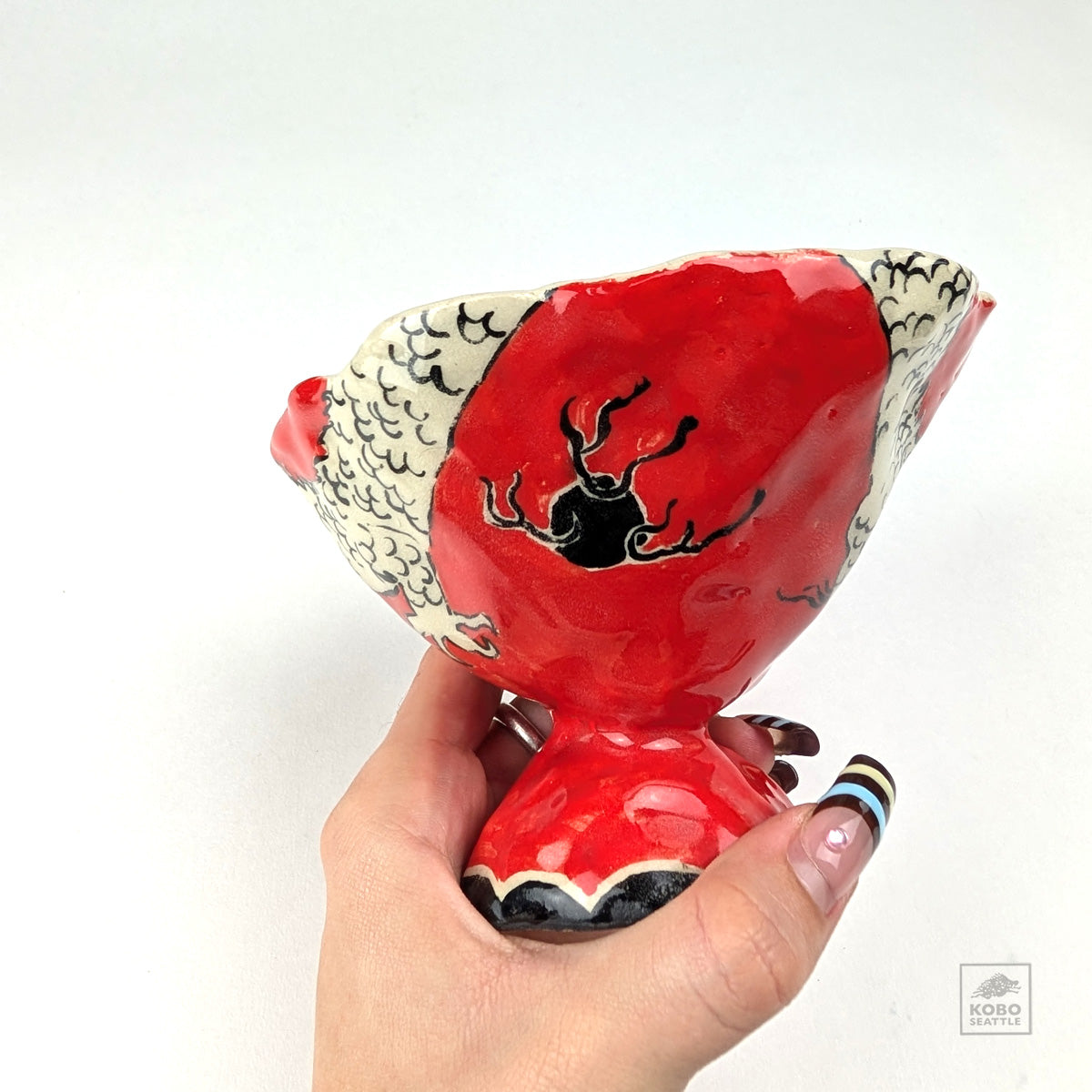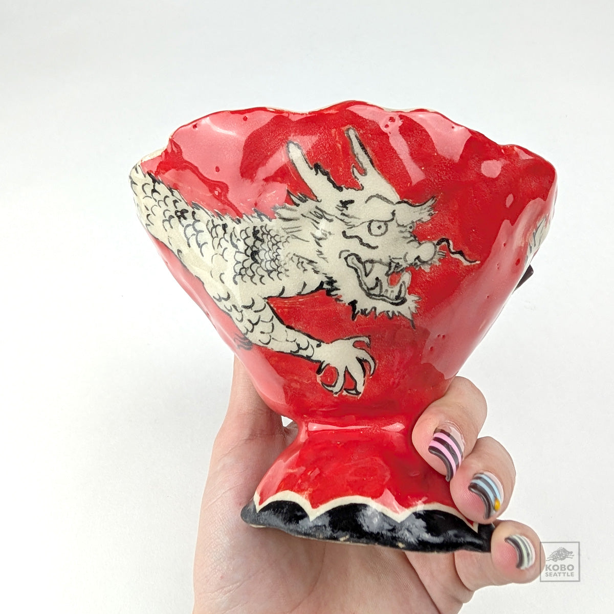 Handbuild stoneware cup under glazed with dragon