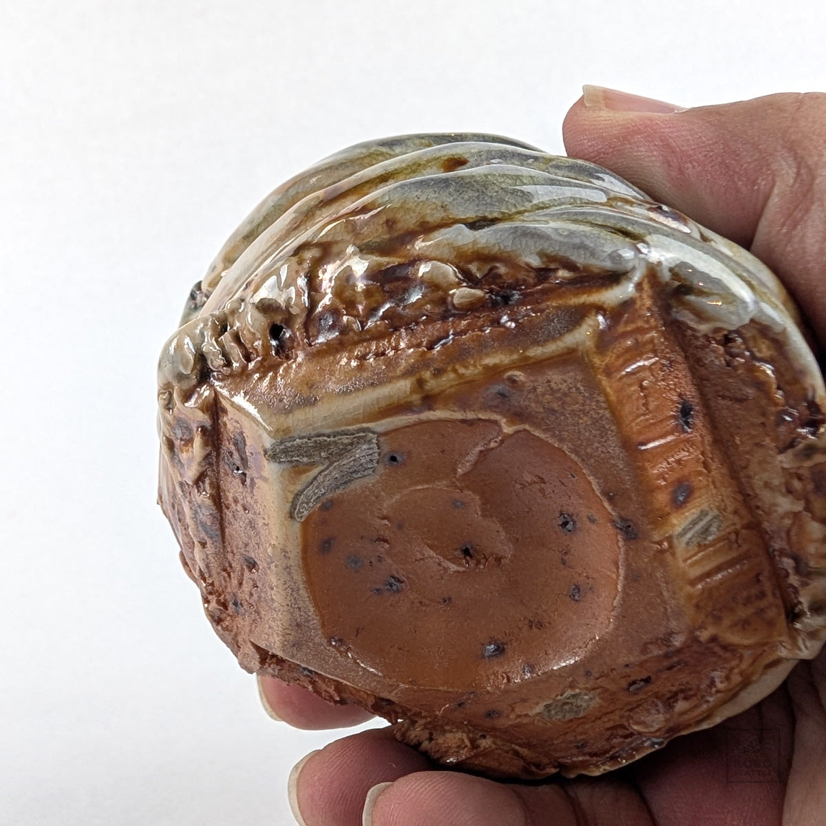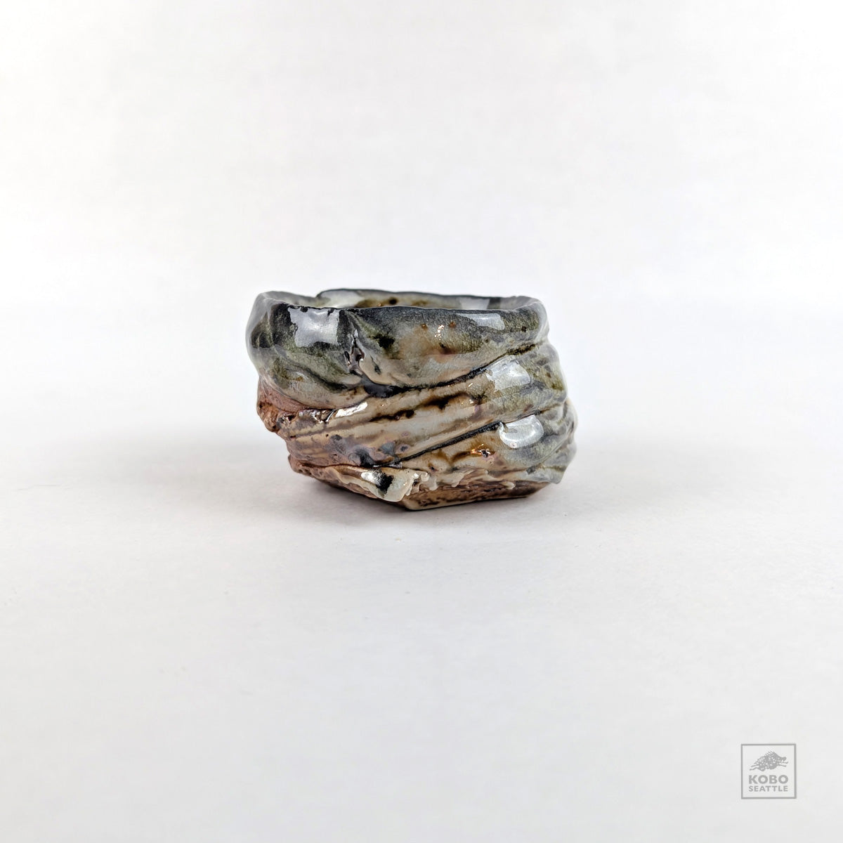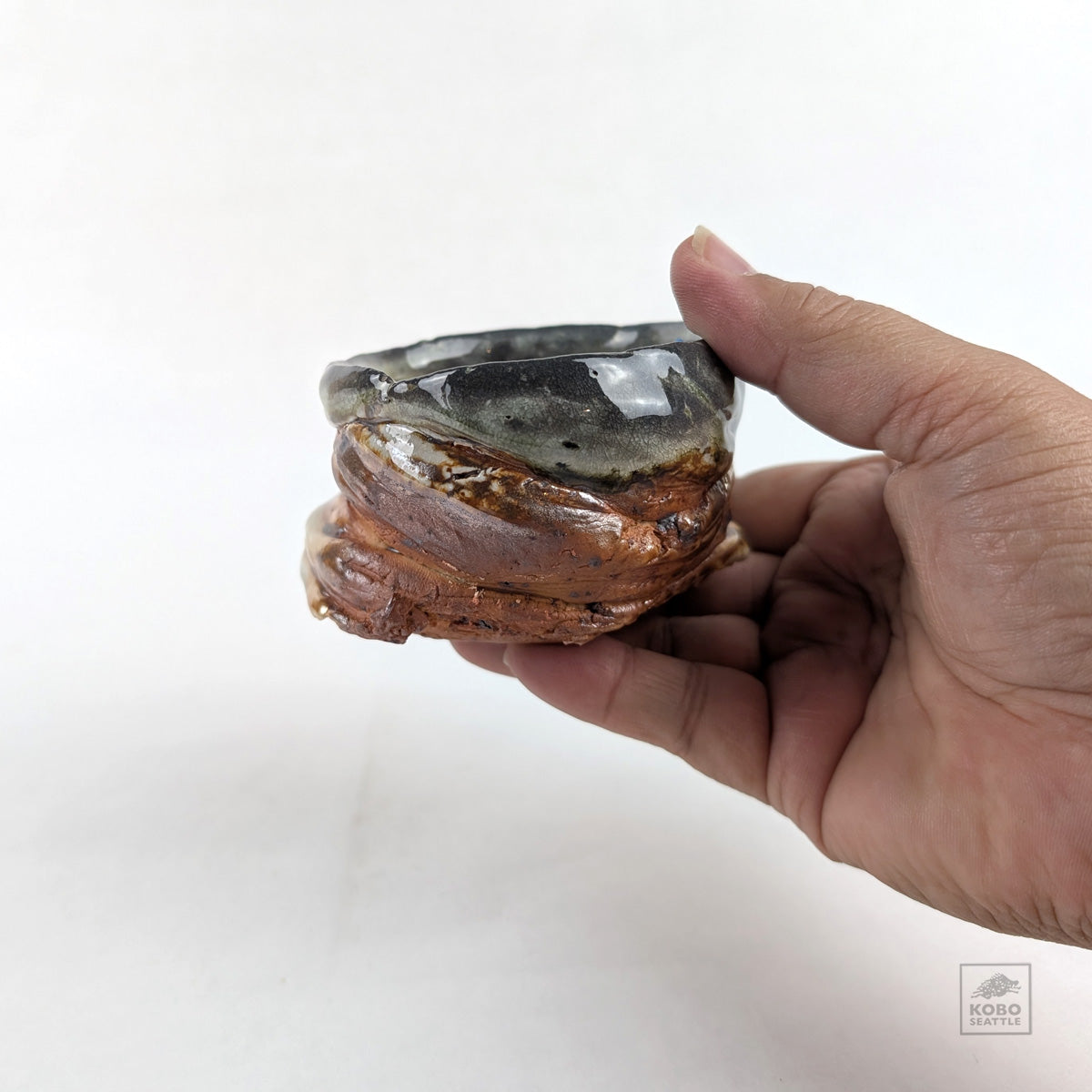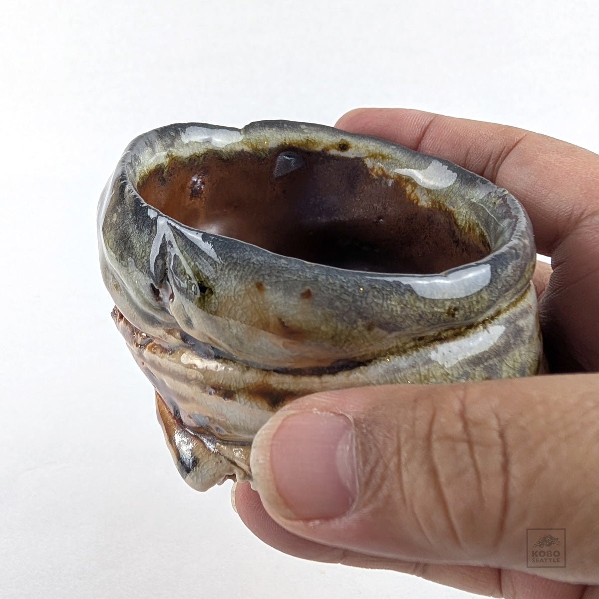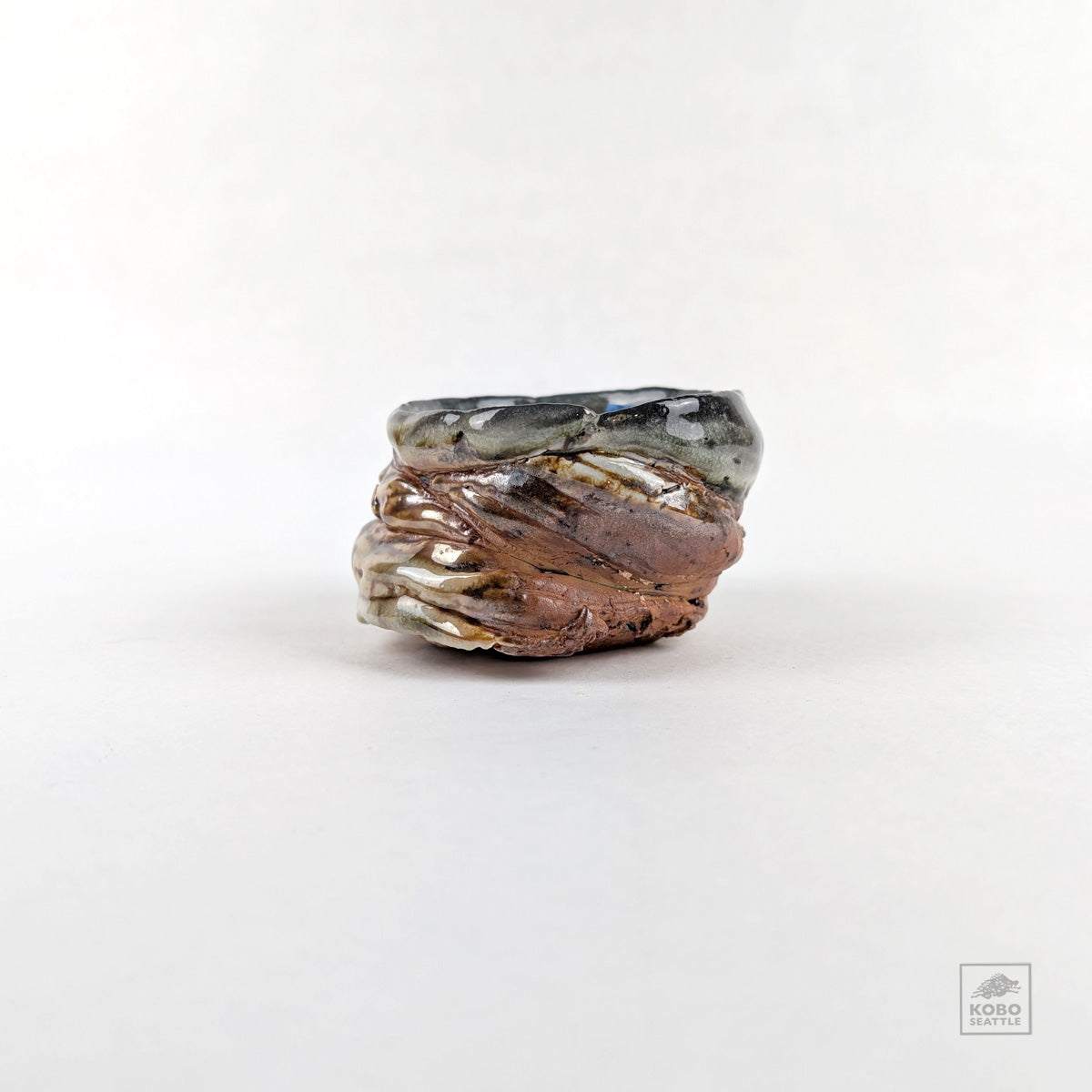 Wood-Soda fired "Squidgey cup", Kurinuki, wild clay liner glaze, porcelain w/wild inclusions