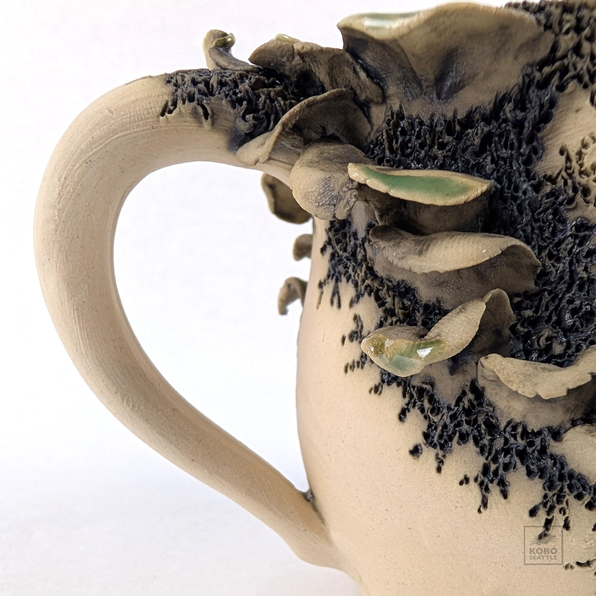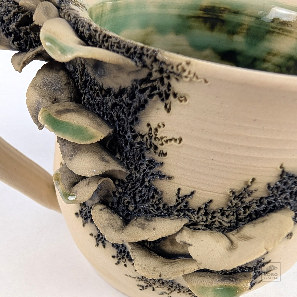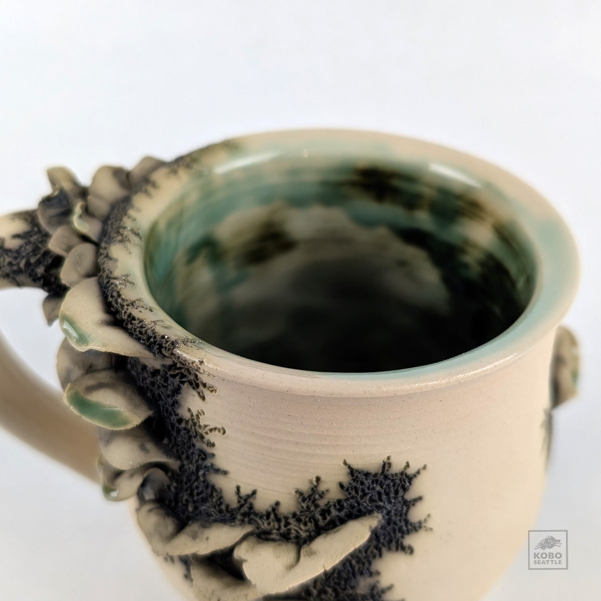 Green Turkey Tail Handled mug: Pinched Protrusions on form like little shelves