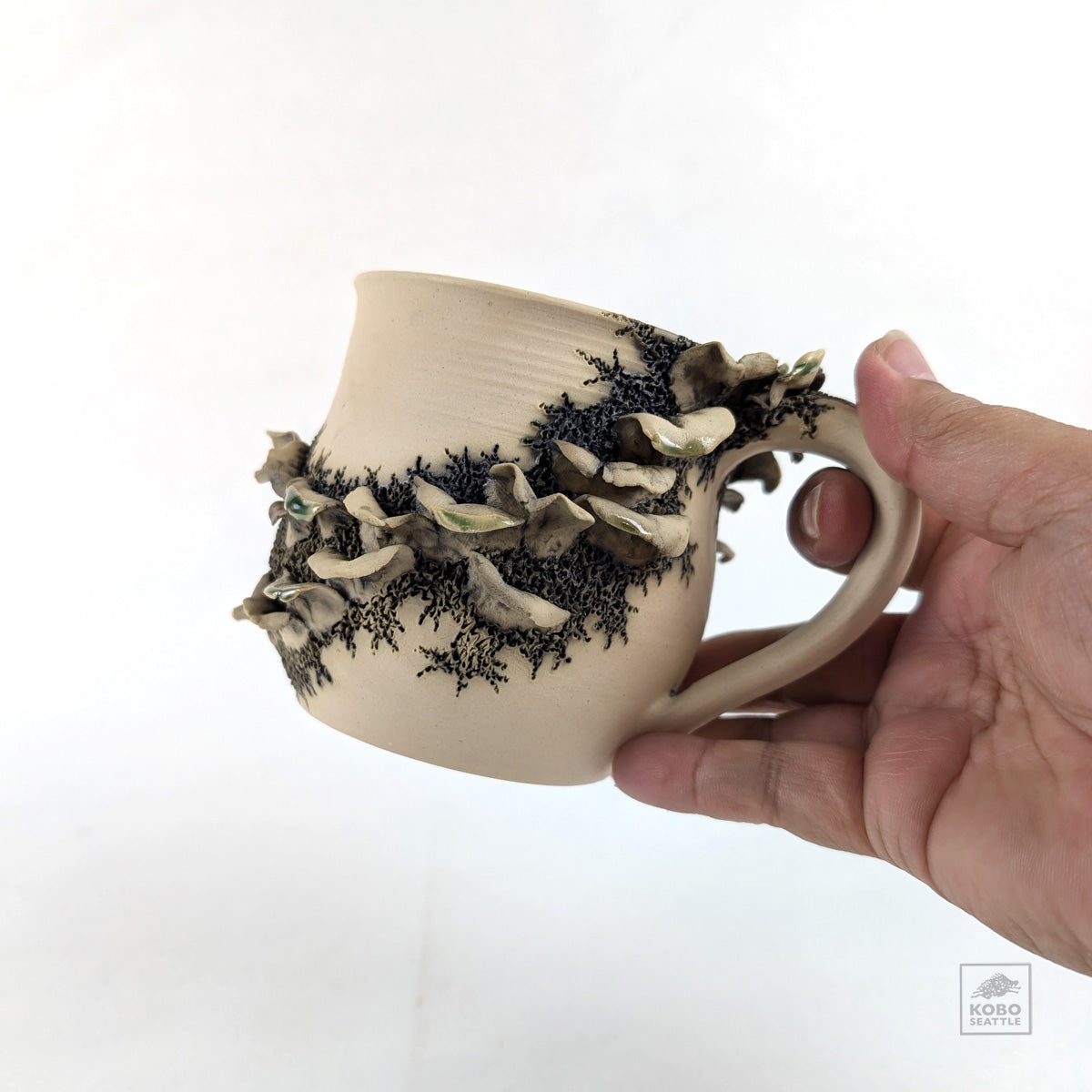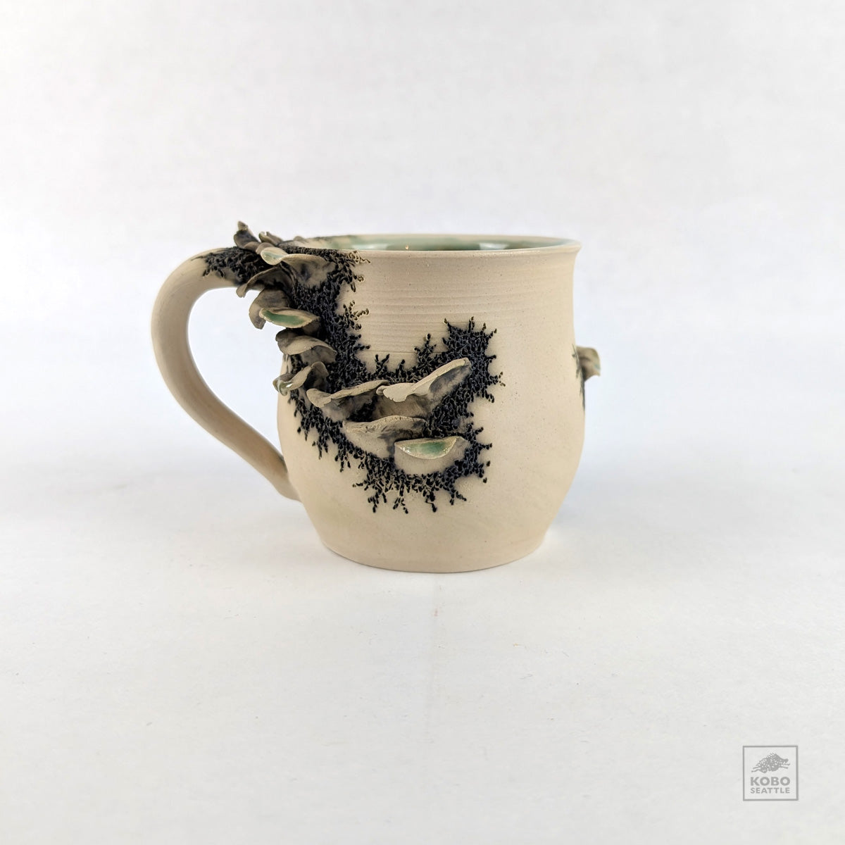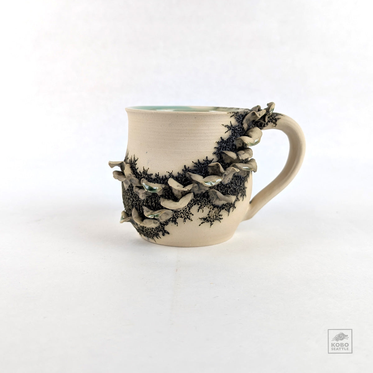 Green Turkey Tail Handled mug: Pinched Protrusions on form like little shelves