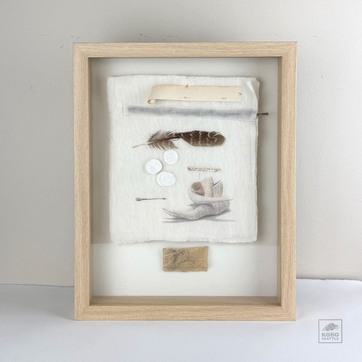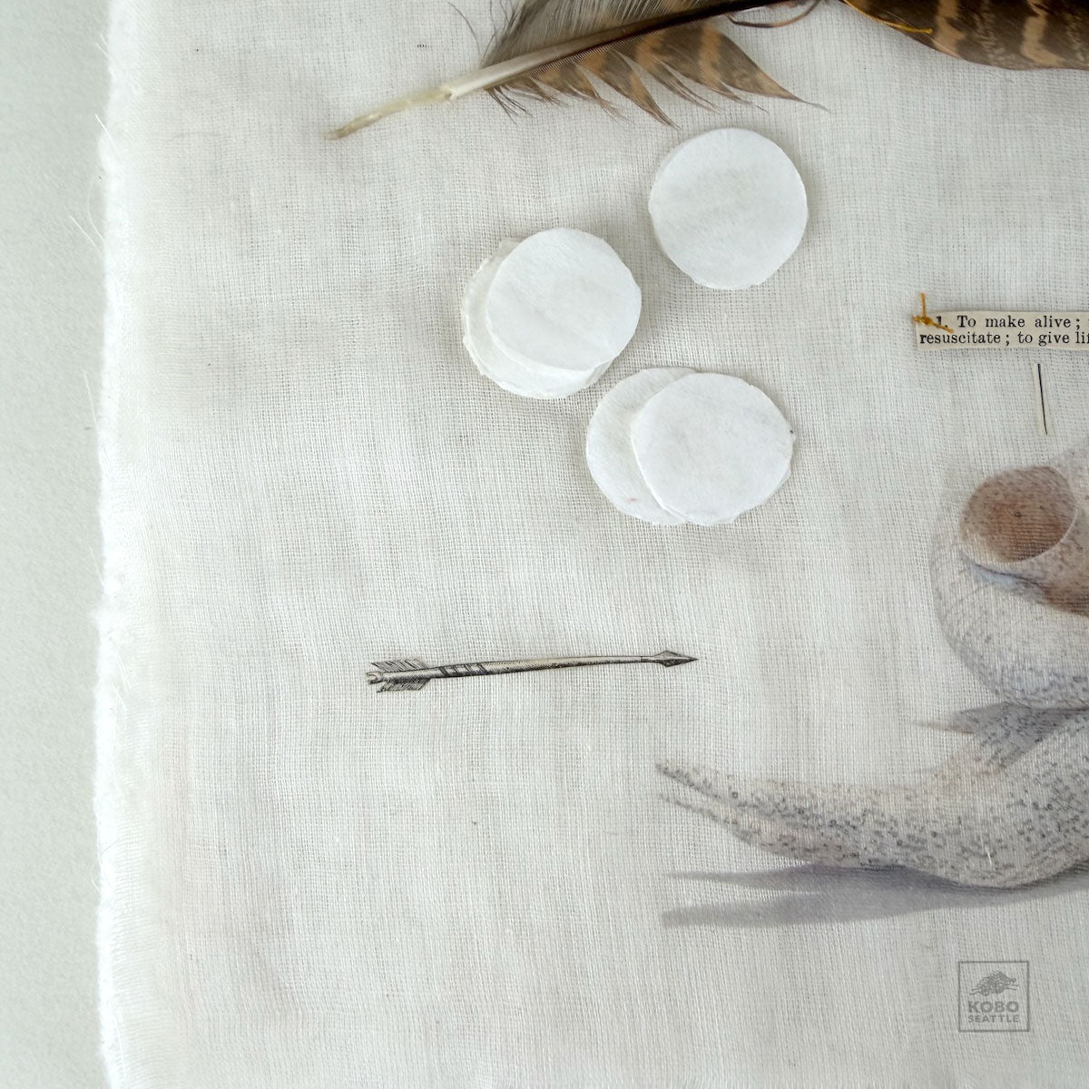 Materials: cotton muslin, cotton batting, ephemera, washi, feather, twig, thread.