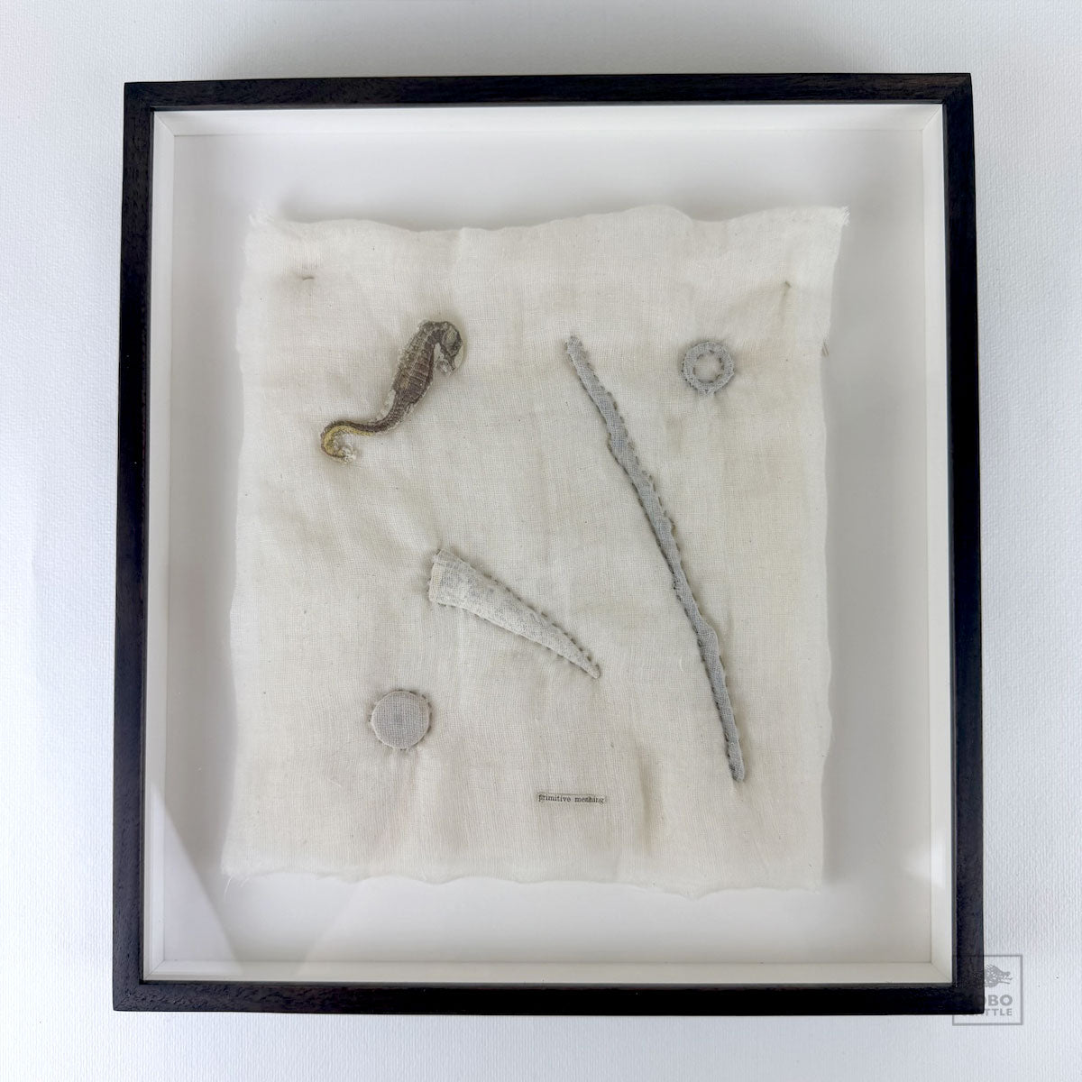Materials: cotton muslin, cotton batting, ephemera, wood bead, twig, metal ring.