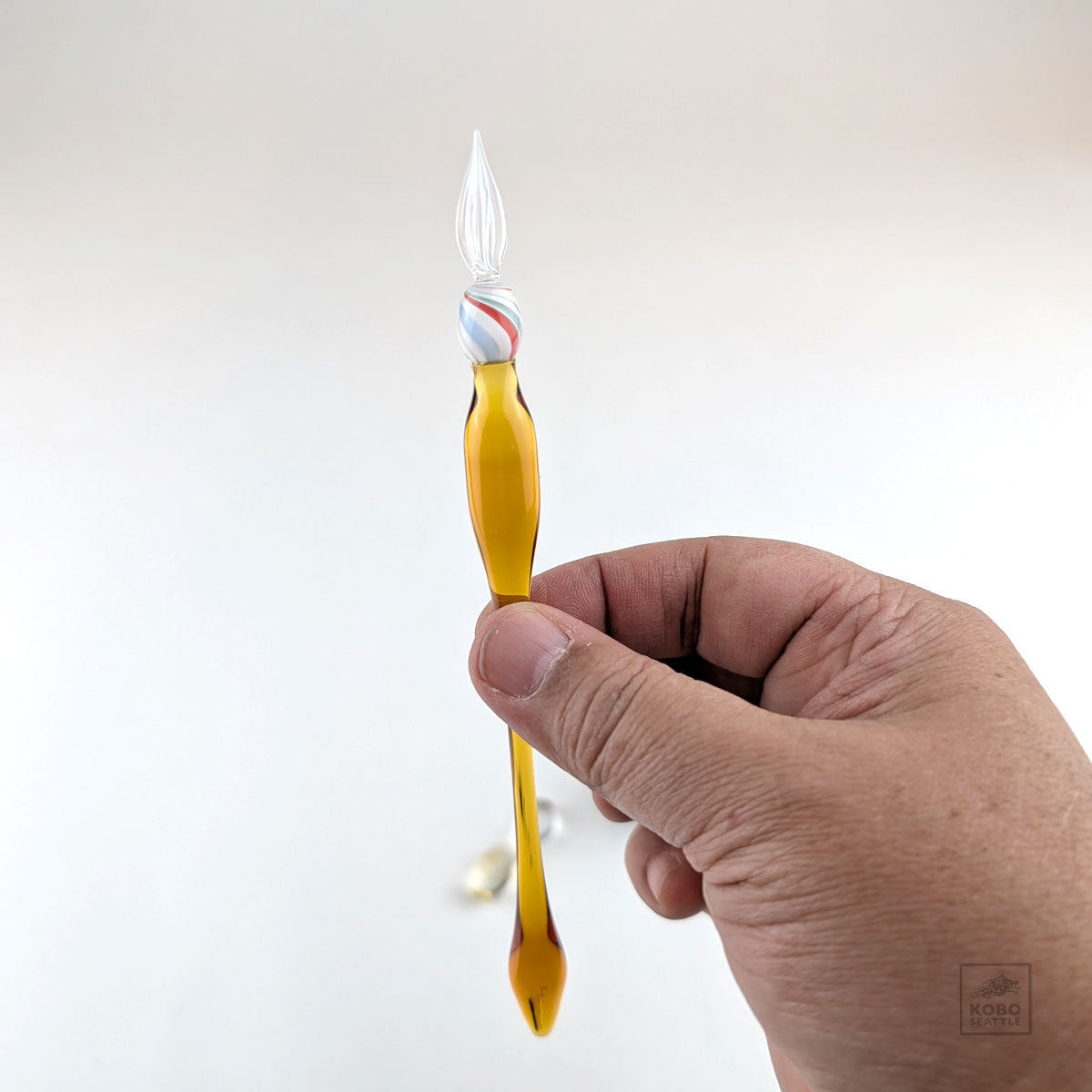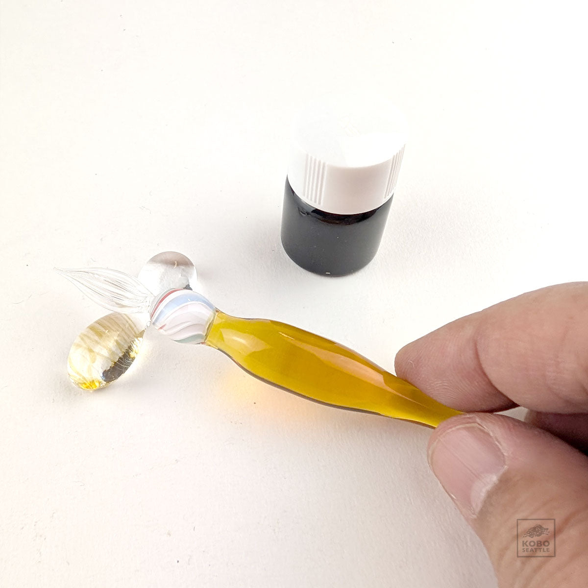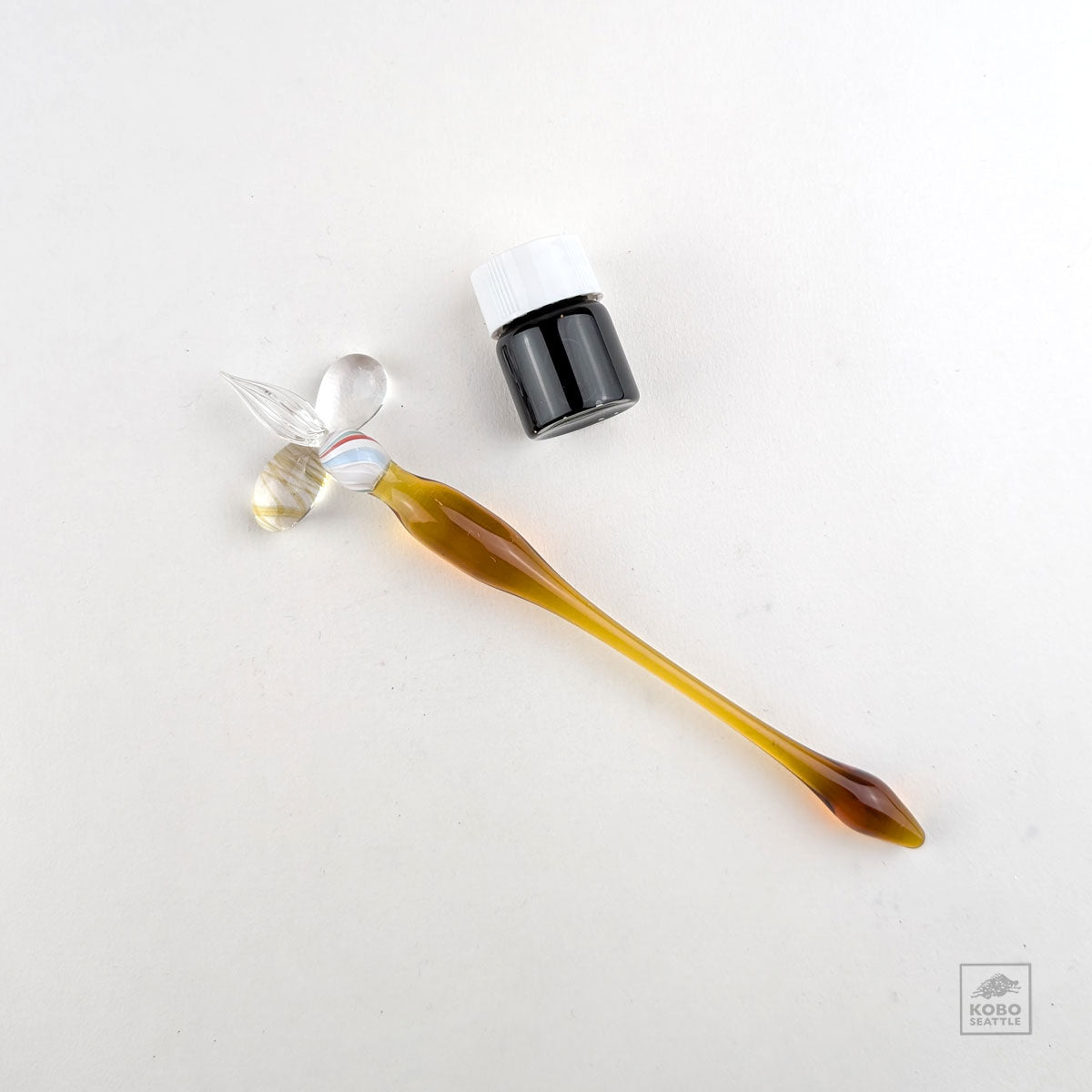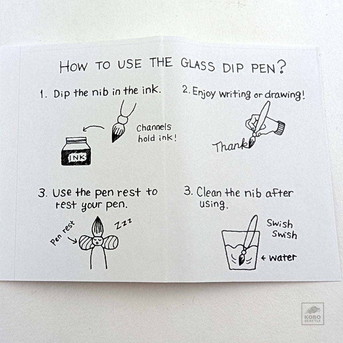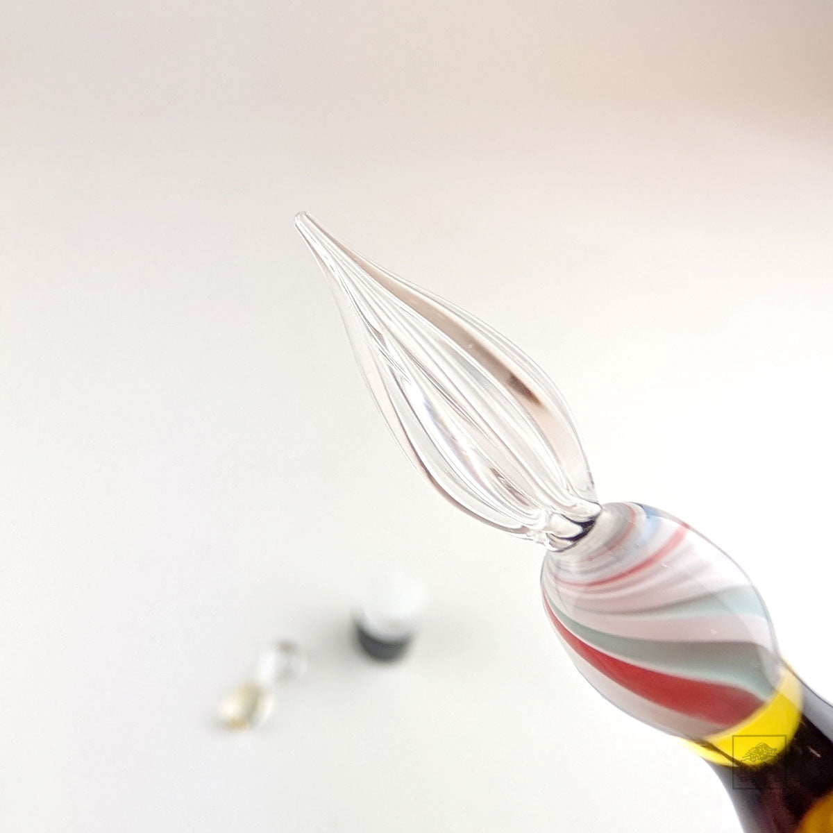 Handcrafted glass dip pen. It comes with a glass pen rest and black ink. This pen was designed and crafted by JMCraft Store, and it is one of a kind. The nib was ground and polished carefully by hand, so it is soft and smooth to write or draw.