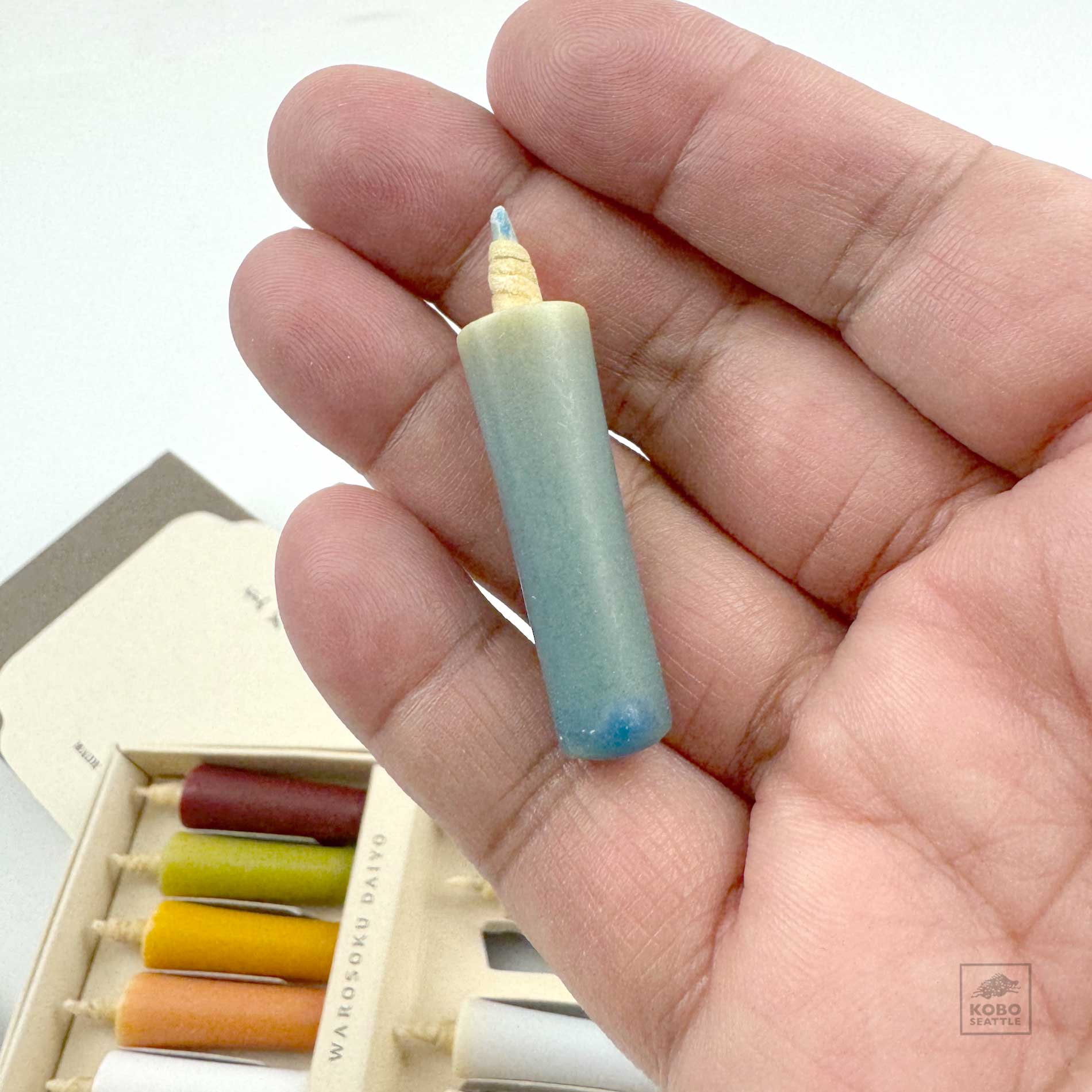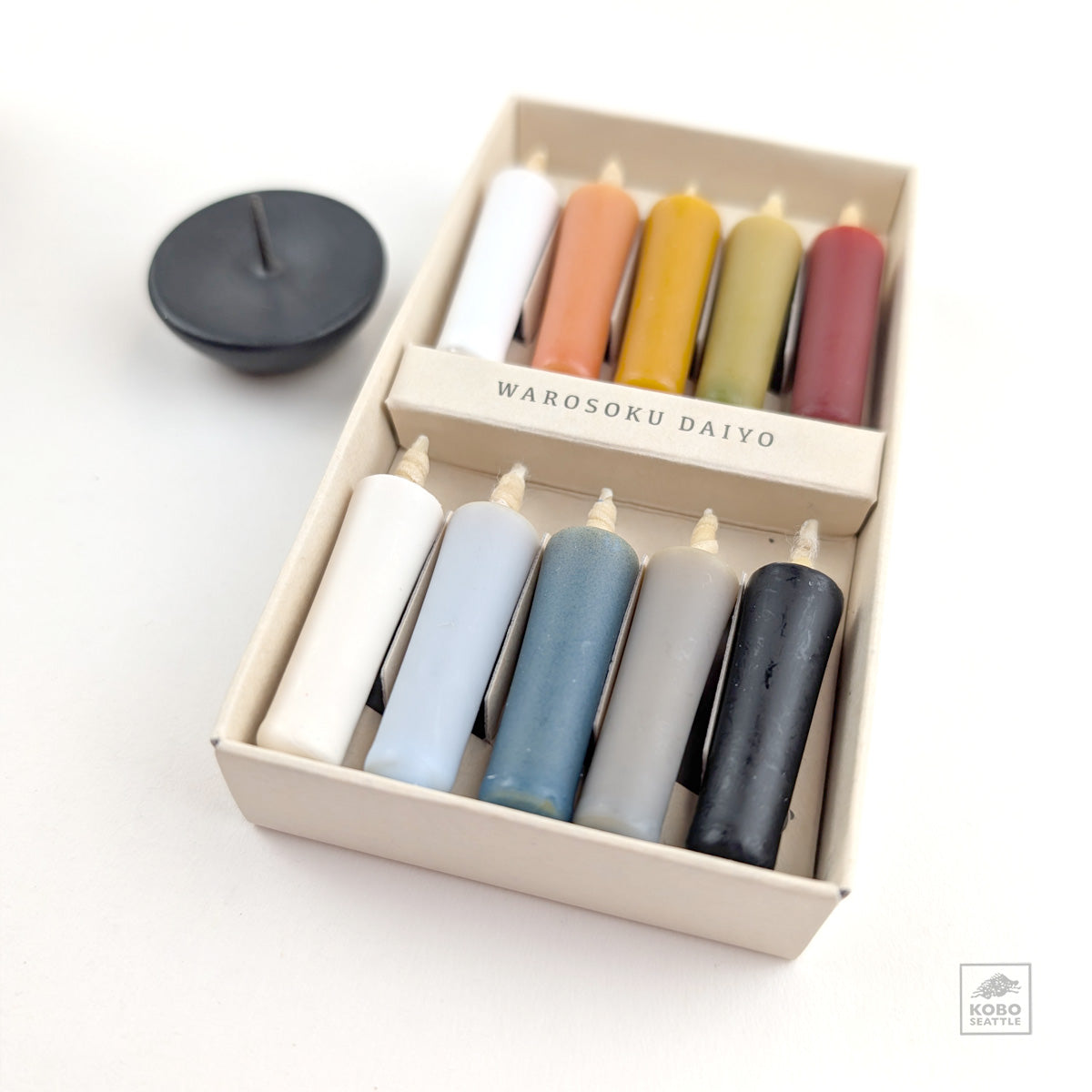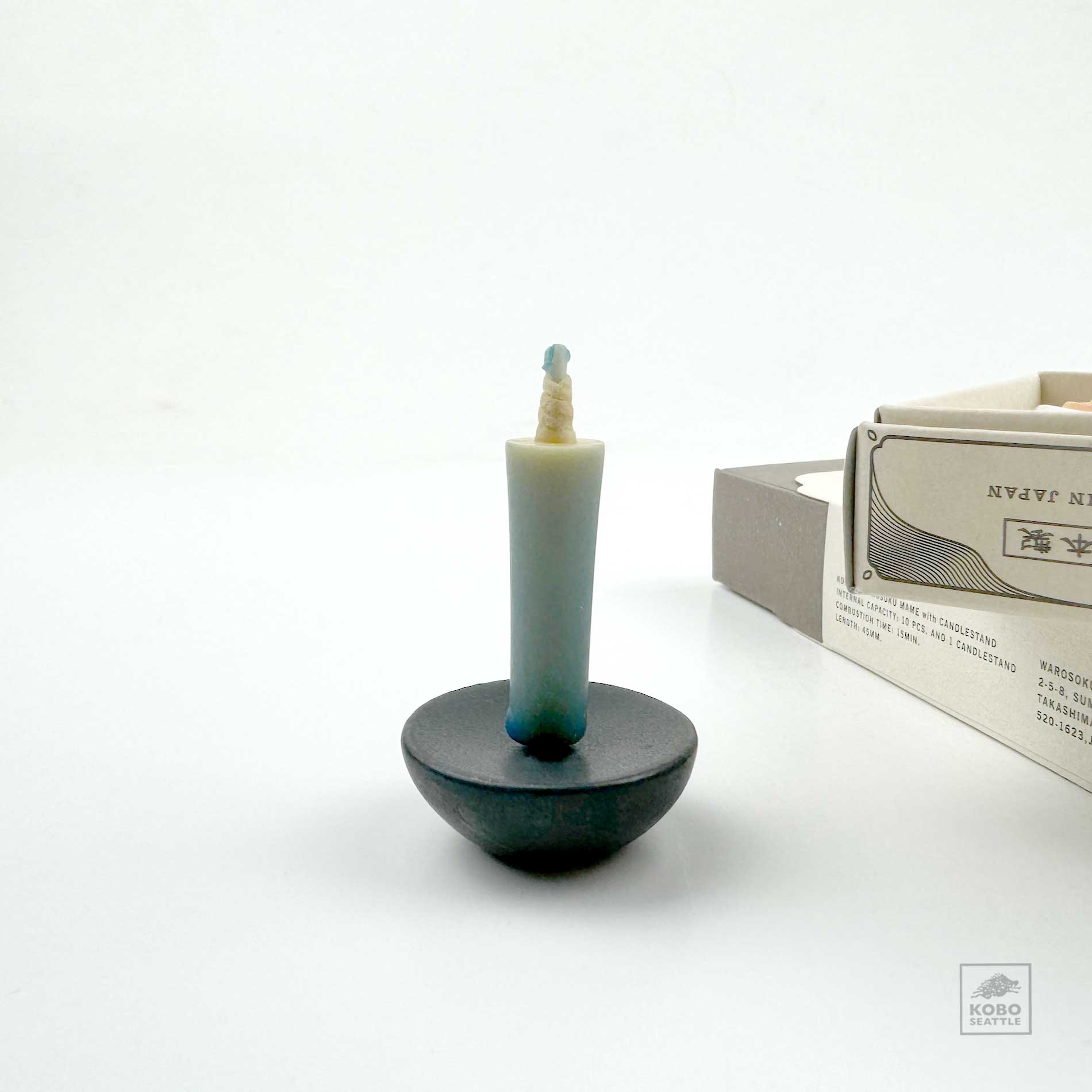 Ten candle set, made of rice wax, and in an assortment of colors. An ceramic and iron candle holder is included. You no longer have to worry about the right combination of candles and a holder, just grab and go! Candles burn for 15 minutes each.
