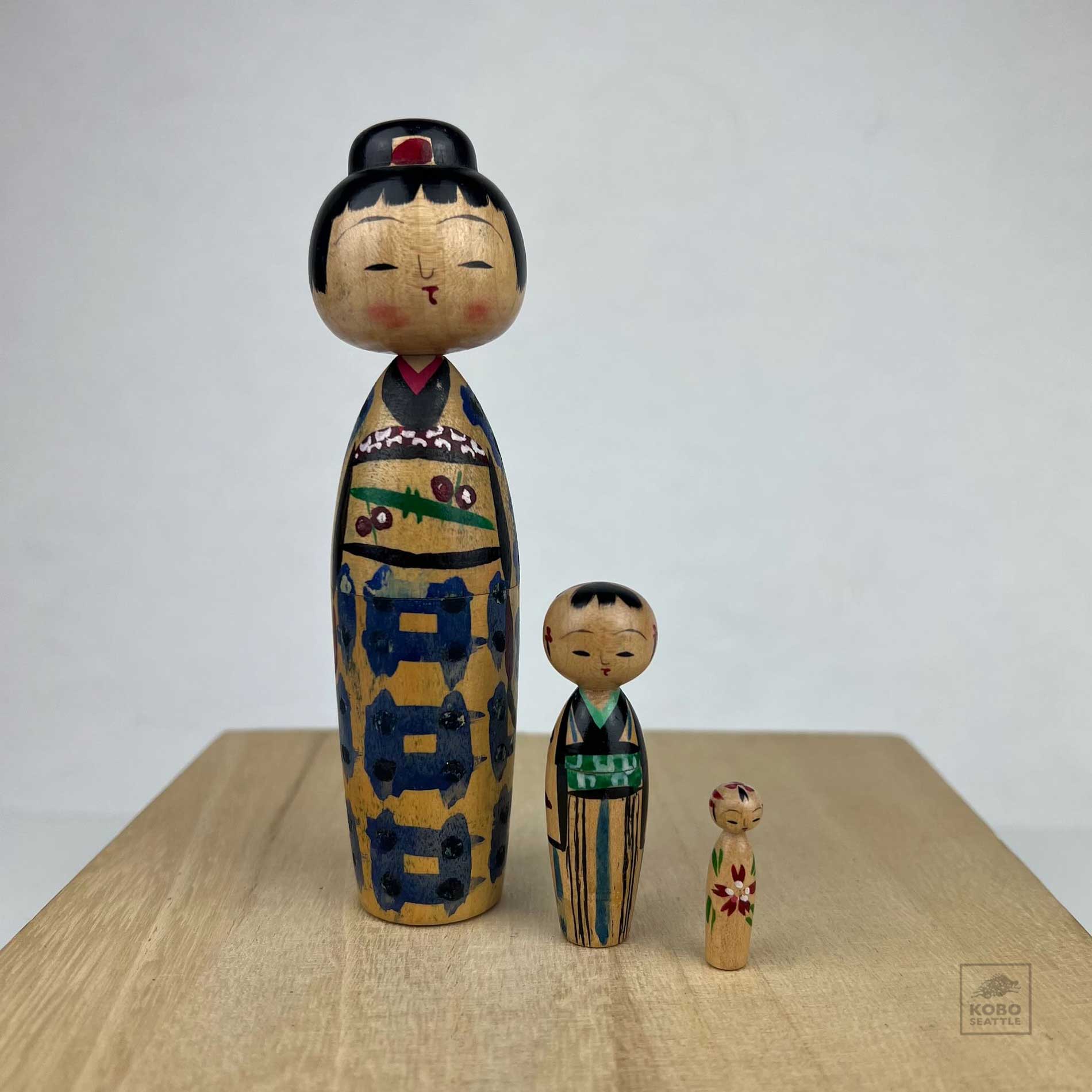 Vintage Japanese kokeshi. Wood dolls, hand made and painted. Three dolls included.