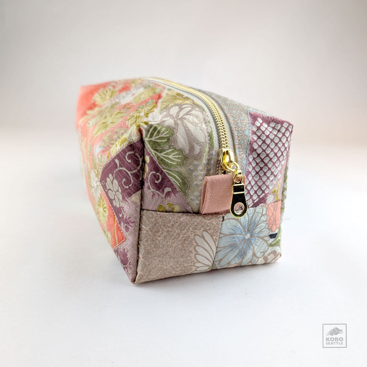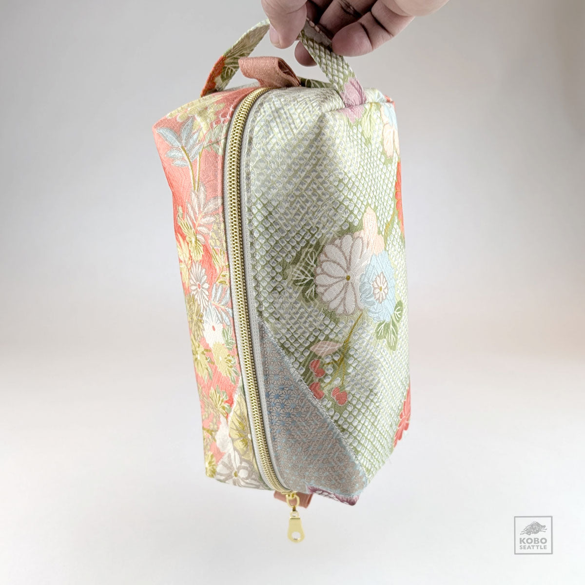 Made with vintage obi fabric. This size is like a dop/travel bag or make-up bag. Zippered with a loop at one end.