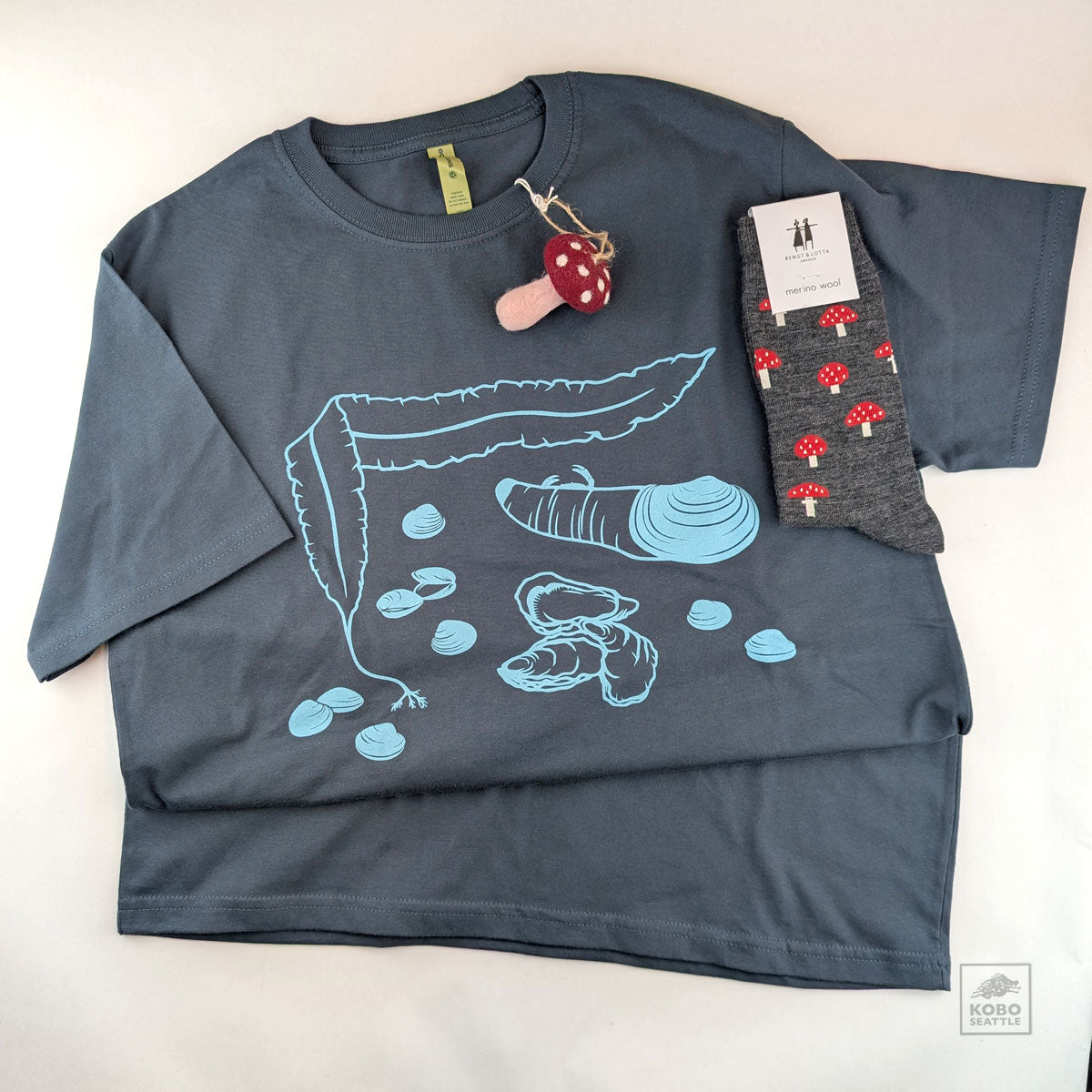 Blue 100% Organic Cotton ring-spun jersey t-shirt, screen printed with environmentally-friendly ink. Geoduck, oysters, clams, oh my! Printed in the PNW.