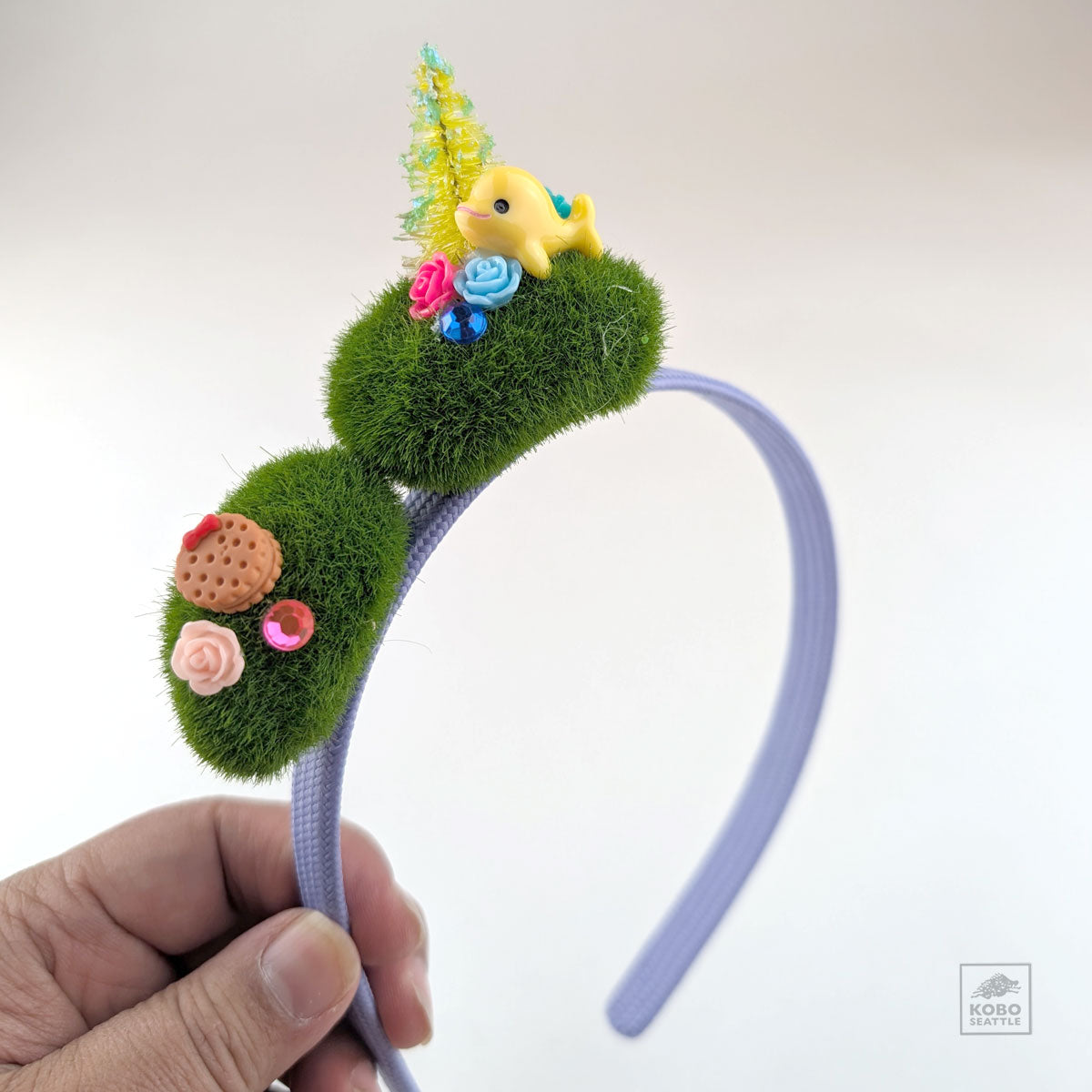 Whale on a mossy hill with treats and flowers! Always positive, creative and fun. Made by Two Squirrels and a Nut in Seattle, WA.