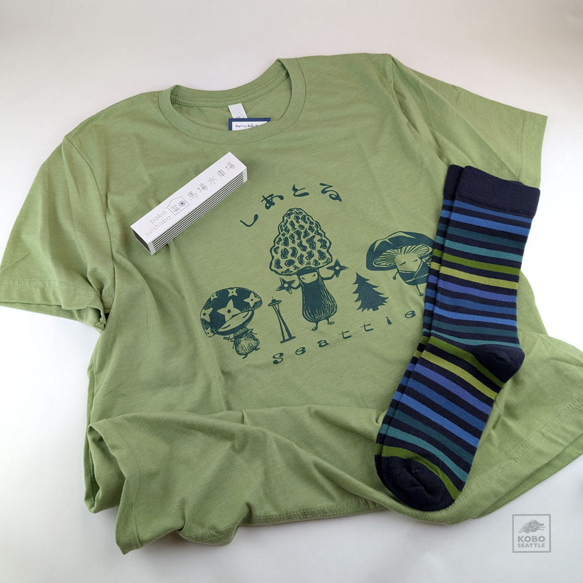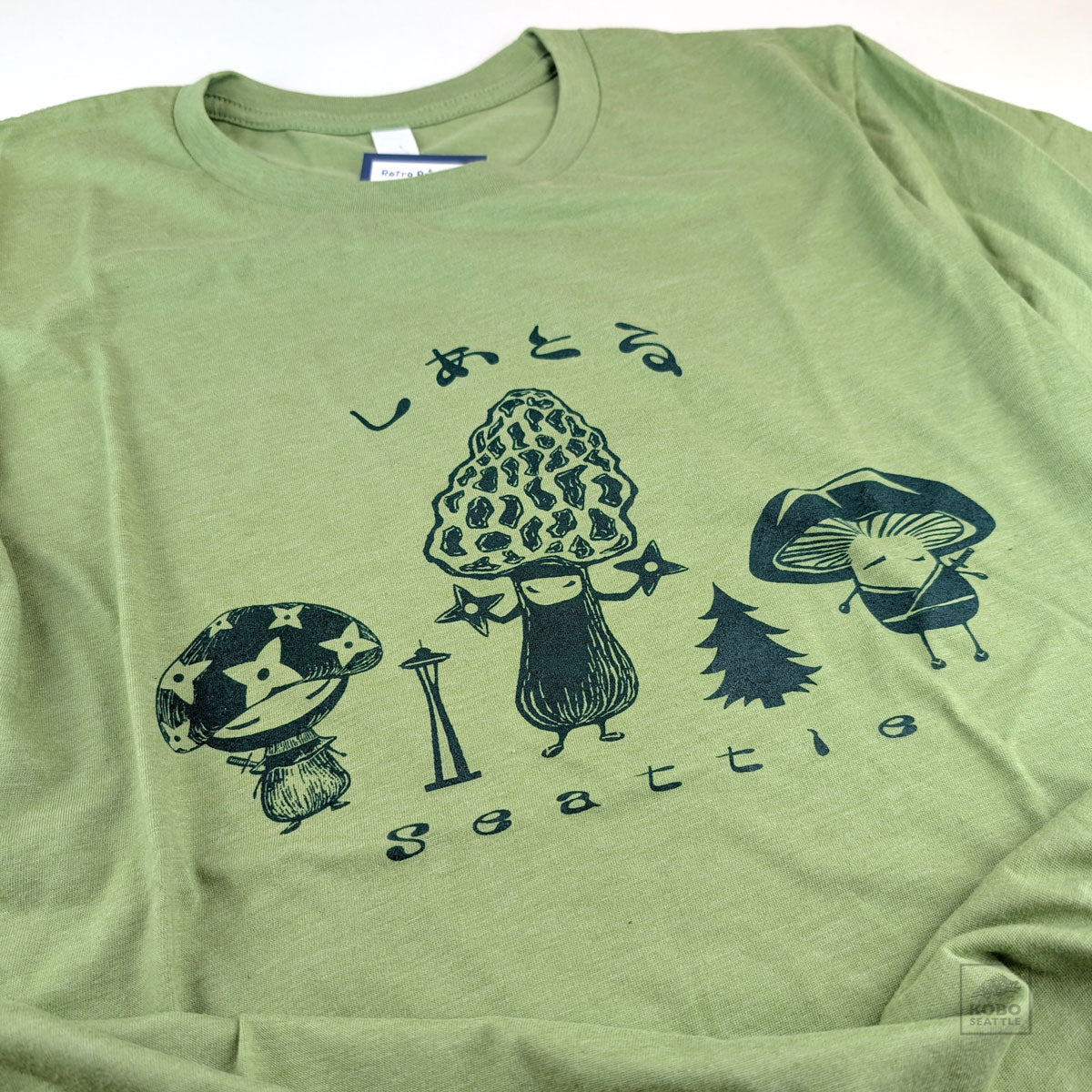 Screen printed on green t-shirt. Men's/Unisex Large. 100% preshrunk ringspun cotton jersey knit t-shirt.