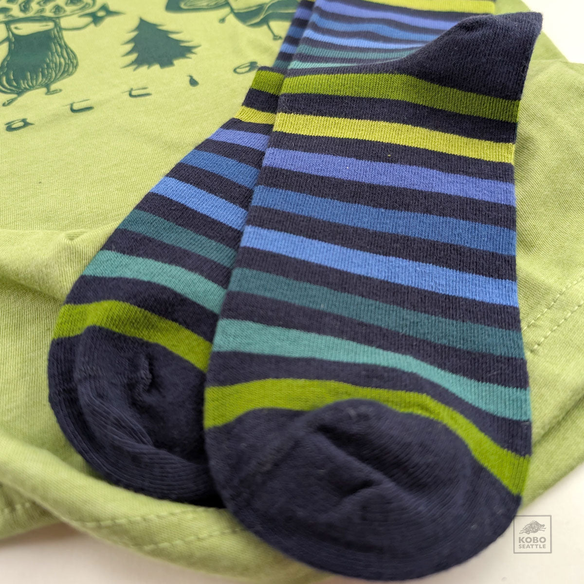 Blues and greens. 81% Cotton, 16% Nylon, 3% Lycra. Fits men's shoe sizes 7-13, women's 8.5-14. Made in the USA.