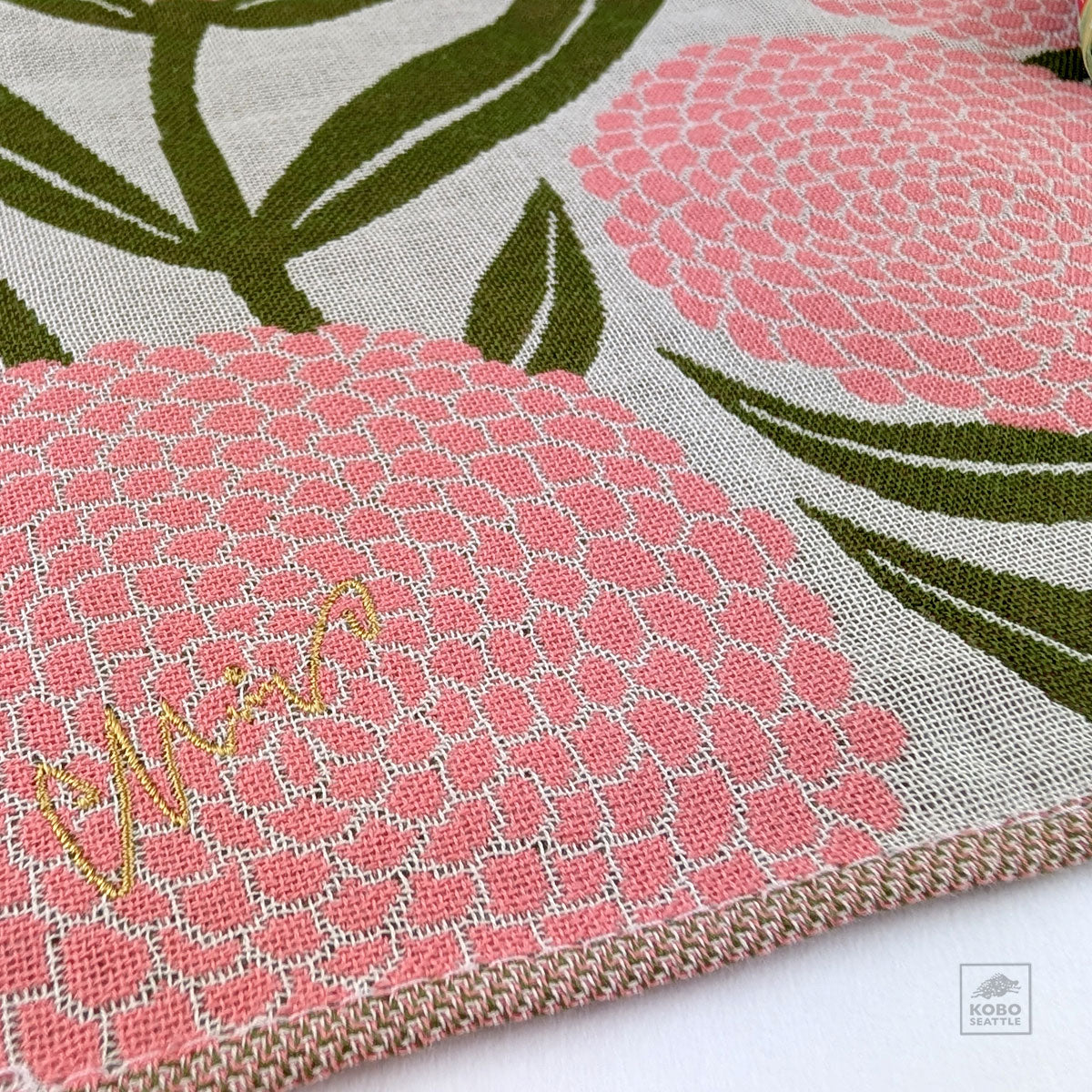 Illustration by Japanese artist MiW/Morita. Floral motif with an embroidered praying mantis. Face towel or handkerchief. 10'' x 10''. Designed in Japan.