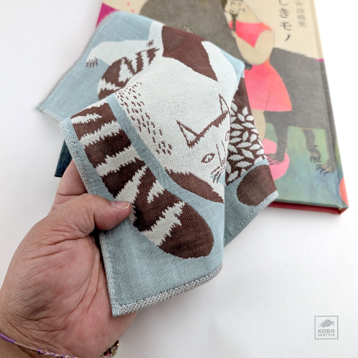 Cat catching an embroidered leaf. 10'' x 10''. Face towel or handkerchief.