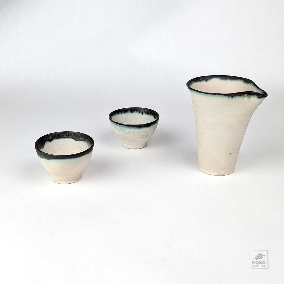 White Glaze Bronze Chirori with Kintsugi applied and two Sakazuki sake cups.