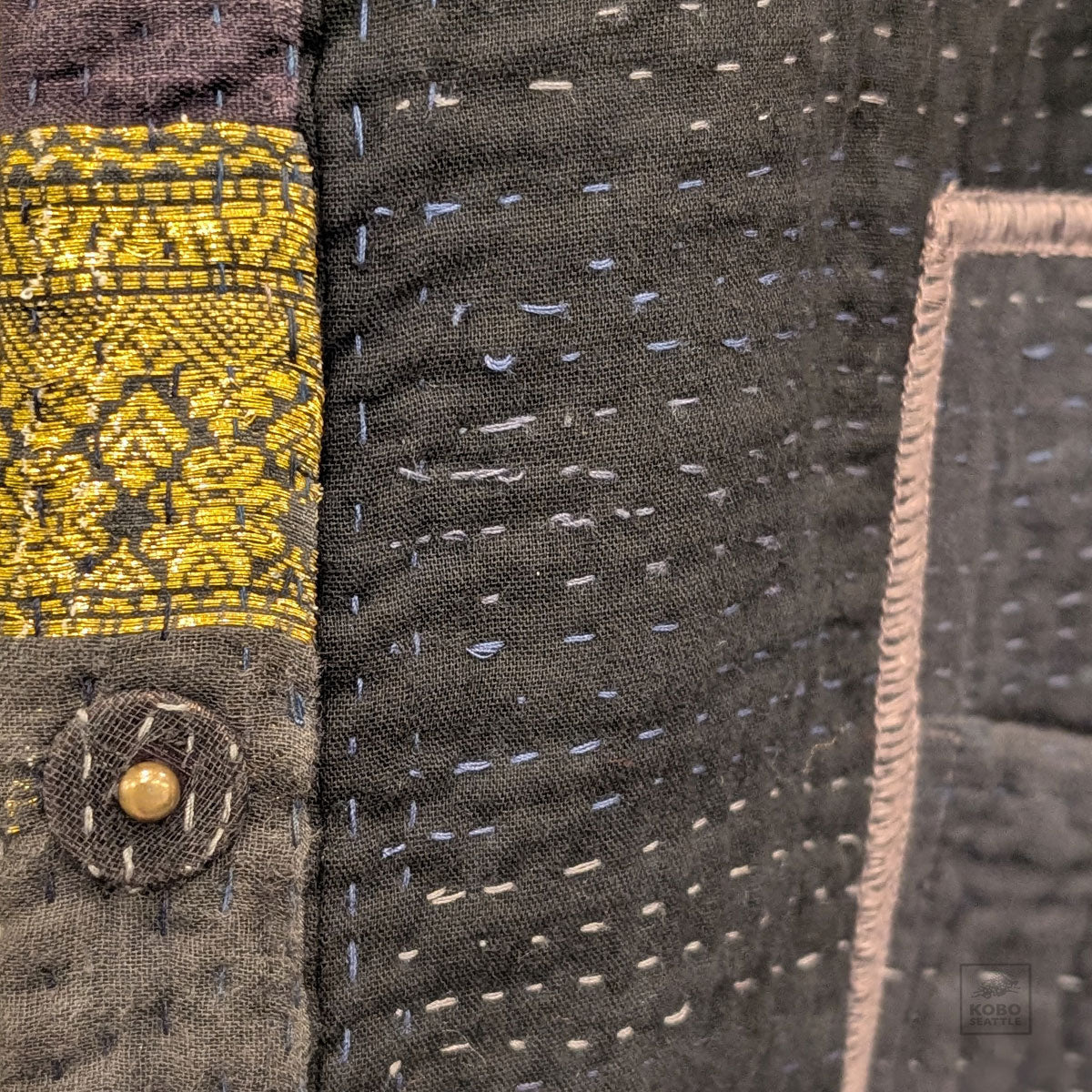 80% Cotton, 20% Silk; Medium Weight; 4-Layer Vintage Saris with Hand Stitches on Entire Garment; Reversible; Front Side is Cotton and Silk Patch; Reverse Side is Vintage Cotton Over Dye