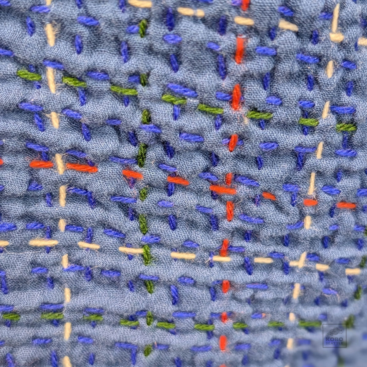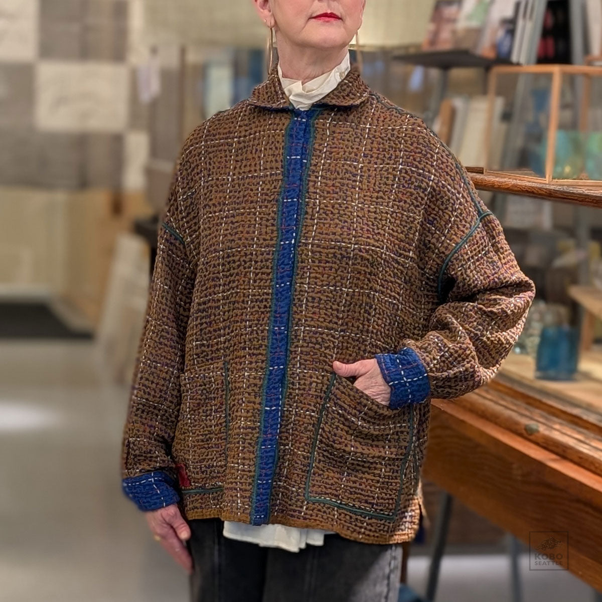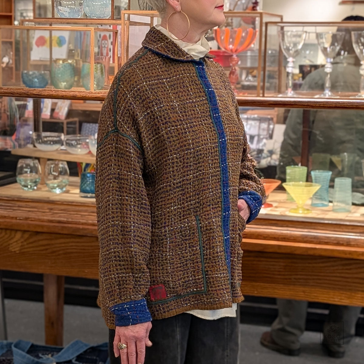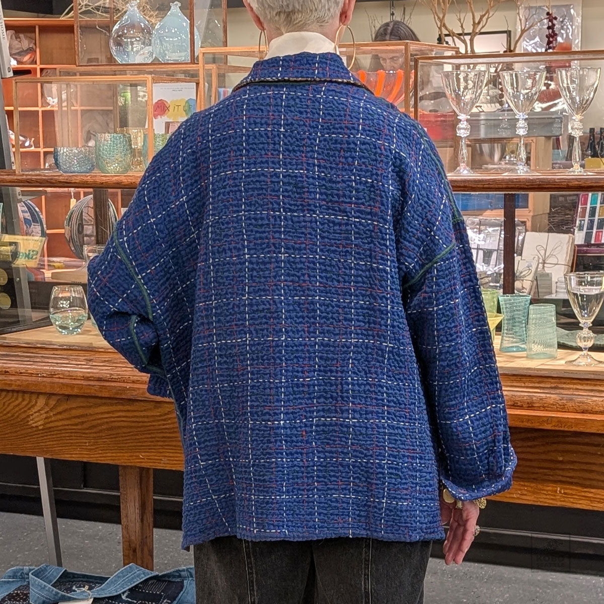 100% Cotton; Kantha Hand Stitch Thread 100% Wool; Medium Weight; 3-Layer Vintage Saris with Hand Stitches on Entire Garment; Reversible; Front Side is Vintage Cotton Over Dye; Reverse Side is Vintage Cotton Over Dye
